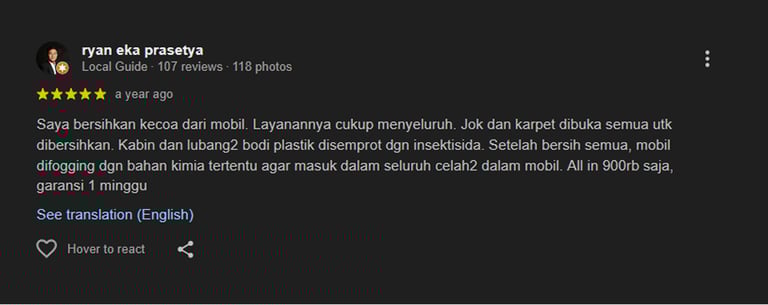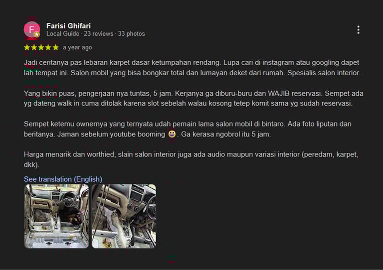 Carwax adalah layanan salon mobil profesional yang fokus pada perawatan interior kendaraan. Kami menghadirkan solusi menyeluruh seperti interior cleaning, pembersihan mobil bekas kebanjiran (flood cleaning), hingga fogging untuk membasmi serangga dan bakteri di kabin. Dengan tim teknisi berpengalaman, Carwax berkomitmen memberikan hasil maksimal—mulai dari menghilangkan bau, jamur, hingga mengembalikan warna interior agar tampak seperti baru.