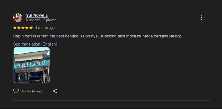 Menjadi layanan salon mobil terpercaya di Indonesia yang menghadirkan interior kendaraan yang bersih, sehat, dan nyaman, serta menjadi partner utama bagi individu maupun bisnis dalam perawatan kendaraan.